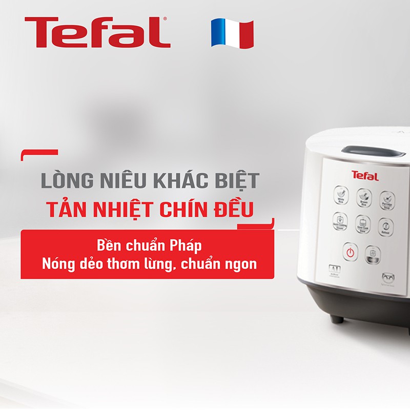 Nồi cơm lòng nồi Niêu tản nhiệt đều cho cơm ngon Lòng nồi niêu dày 1.5mm với 6 lớp tích hợp Công nghệ Fuzzy logic - 8 chương trình nấu THÔNG SỐ KỸ THUẬT: Loại nồi: Nồi cơm điện tử Dung tích nồi: 1.8 lít Số người ăn: 4 - 6 người Chất liệu lòng nồi: Hợp kim phủ chống dính Công nghệ nấu: 3D (Toả nhiệt từ 3 hướng) Chức năng nấu: 8 Chế độ nấu Tiện ích: - Giữ ấm 12h - Có xửng hấp - Nồi chống dính Điều khiển: Nút nhấn Dây điện: Có thể tháo rời khỏi nồi Công suất: 750 W Độ dày lòng nồi:1.5 mm Kích thước: Ngang 26.2 cm - Cao 24.5 cm - Sâu 35 cm Khối lượng: 4.2 kg Thương hiệu của: Pháp Nơi sản xuất: Trung Quốc Năm ra mắt: 2020 ĐẶC ĐIỂM NỔI BẬT: Nồi cơm điện tử Tefal 1.8 lít RK732168 thiết kế màu trắng trang nhã, vỏ nồi bằng chất liệu nhựa cao cấp, chịu nhiệt tốt, dễ dàng vệ sinh khi dính bụi bẩn Dung tích 1.8 lít thích hợp dùng trong gia đình có từ 4 – 6 thành viên Bảng điều khiển tiếng Việt có chú thích chức năng bằng hình ảnh rõ ràng, dễ thao tác với 8 chế độ nấu đa dạng từ nấu cơm, hâm nóng, nấu cháo, nấu súp, hầm... Các chế độ nấu trong nồi cơm điện đã được cài đặt sẵn người dùng chỉ cần bấm chọn chức năng, giúp tiết kiệm được thời gian chuẩn bị bữa ăn ngon cho gia đình. Lòng nồi niêu độc quyền cùng 2 góc vàng 62 độ giúp tuần hoàn nhiệt tối ưu Lòng nồi 4 lớp dày 1.5 mm bằng hợp kim nhôm với công nghệ phủ 2 lớp chống dính liên tiếp giúp tăng độ bền chắc, dễ dàng lau chùi vệ sinh sau khi sử dụng Cơm chín nhanh, tiết kiệm điện nhờ công nghệ tản nhiệt đa chiều và công suất 750 W Nồi cơm điện Tefal được trang bị công nghệ 3D hiện đại, không chỉ cho khả năng nấu cơm chính đều mà còn giúp giữ ấm cơm hiệu quả, kéo dài lên đến 12 tiếng. Thiết kế phần dây điện có thể tháo rời sẽ giúp bạn dễ dàng di chuyển Trang bị thêm xửng hấp giúp làm những món hấp đơn giản như rau, củ, xôi, bánh bao, làm bánh,... dễ dàng Lưu ý khi sử dụng nồi cơm điện tử - Nên lau khô mặt ngoài và đáy của lòng nồi cơm trước khi đặt vào nồi cơm điện để bảo vệ cho mâm nhiệt. - Không dùng miếng nhám chà nồi, đồ chà nồi có chứa kim loại sẽ làm trầy lớp chống dính. - Đặt nồi cơm ở nơi thoáng mát, khô ráo, bề mặt phẳng, không đặt gần nguồn nhiệt như bếp gas, lò vi sóng,...